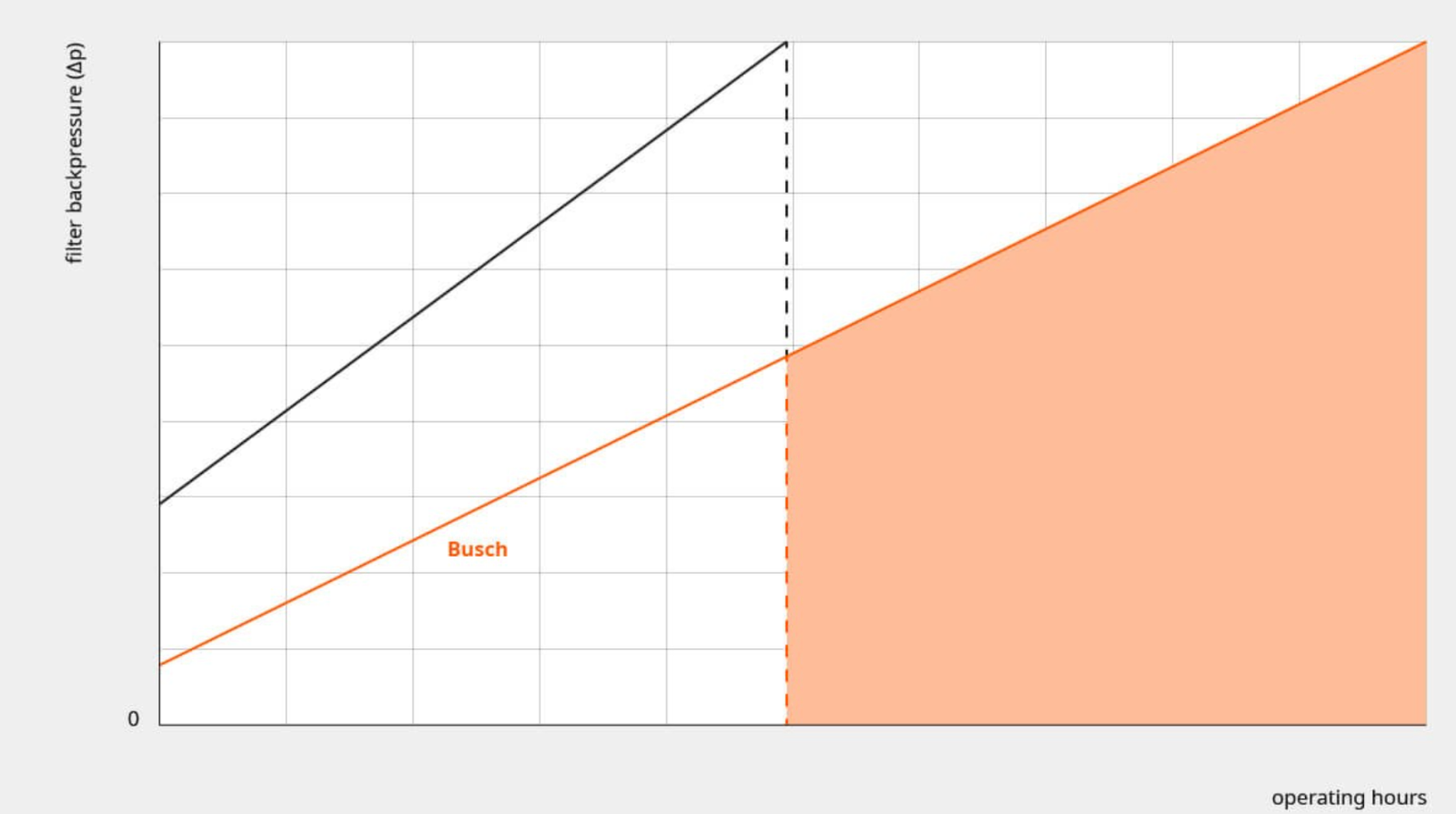 传统的过滤器材料和设计(黑色线)与 Busch 普旭原装排气过滤器(橙色线)相比,前者会更快充满油。过滤器背压迅速增加,这会导致排放的空气流量减少。