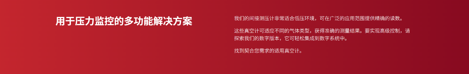 这些真空计可在广泛的压力范围内提供精确的读数,适用于众多工业和科学应用。请探寻我们的间接测压计(包括皮拉尼和电离真空计)的功能,并了解如何根据您的特定要求选择正确的真空计。