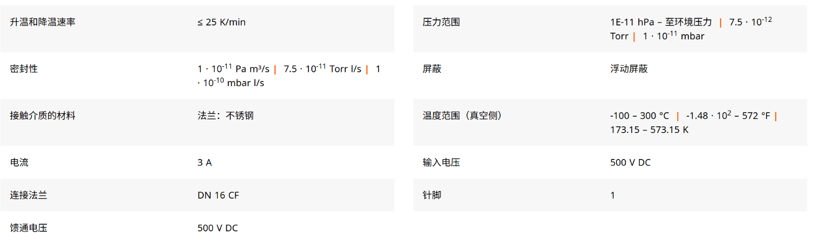 所列的电压和电流与以下环境条件有关:室温,外部干燥气体,内部真空< 1 · 10-4 hPa