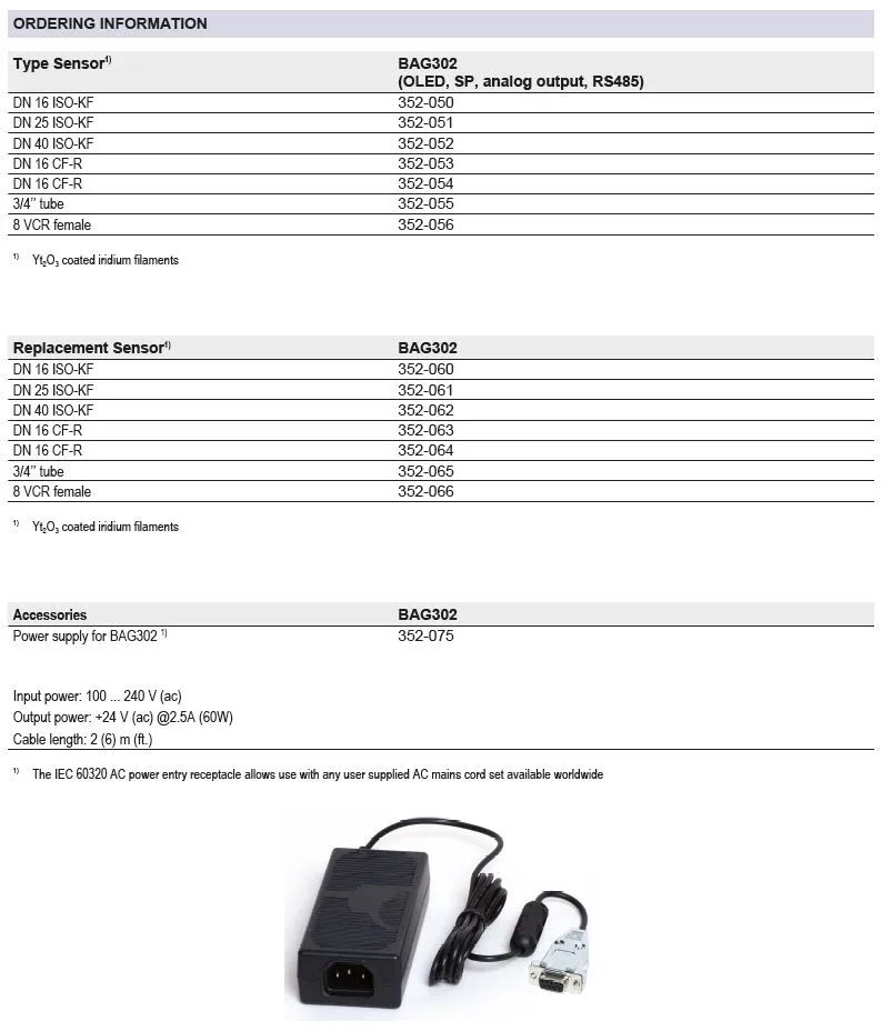 INFICON 单 Bayard-Alpert 热电离真空计 BAG302 涵盖从 1.3 × 10-9 至 6.7 × 10-2 mbar(1 × 10-9 至 5 × 10-2 Torr)的广泛测量范围。紧凑型一体化热电离真空计 BAG302 能够轻松地更换双丝极传感器、内置 OLED 显示器、设定点继电器和对数线性模拟输出以及集成 RS485 数字接口,提高了集成灵活性。这些功能配以坚固的设计,使 BAG302 为其自身的基本压力测量仪器带来经济且可重复的过程,并提供高价值/低拥有成本的选择。