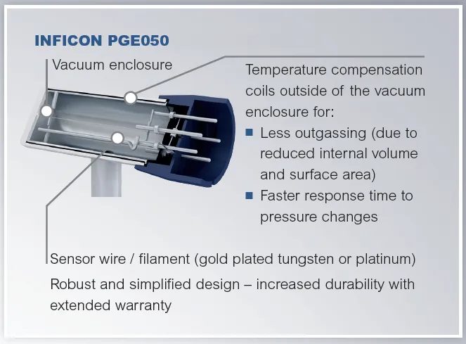 皮拉尼真空计增强型 050 (PGE050) 是主动对流增强型皮拉尼真空计 PGE300 和 PGE500 的被动版本。PGE050 配备了相同的传感器技术,可与我们的 VGC031 和 VGC083 无源压力表控制器单元配合使用。