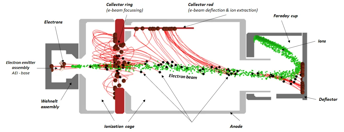 电子离开阴极(左侧),被阳极加速到 200 eV,然后被离子收集器聚焦。电子路径的长度具有良好的特性,因此仪器的灵敏度是可以预测的。电子在阳极栅内产生的离子被加速到收集器,并以电流形式测量。阳极栅外产生的离子会被偏转器捕获。